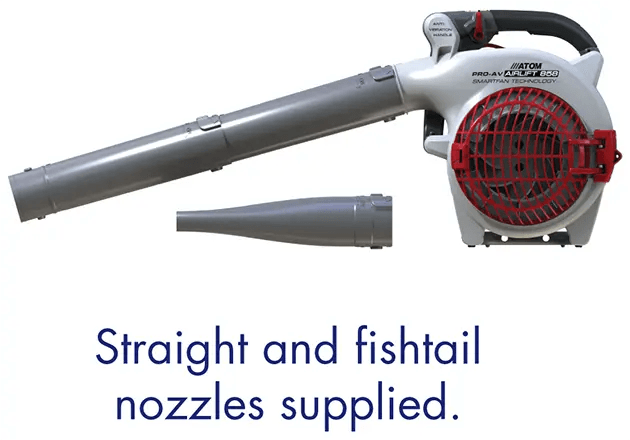 Zero side kick from massive air blast.?Atom?AIRLIFT???(patent pending) hand held blowers are designed for easy starting and massive air output so you do the job quicker. ATOM patented SMARTFAN???blower impellor produces a massive air blast ? more air than other brands. Optional attachments available ? Vacuum, Sliding roof gutter cleaner, and Sprayer Mister.