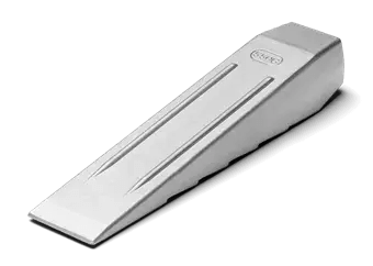 A re-groundable wedge with barb surface on one side that prevents the wedge to go back. Wedges help the tree fall in the direction of the notch cut by actually lifting the tree in that direction. Used to prevent the tree from pinching the saw, or leaning back on the saw. This Aluminium wedge can also be used for splitting logs.