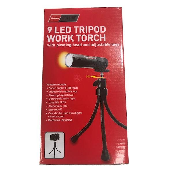 Super bright 9 LED torch | Tripod with flexible legs | Pivoting tripod head | Detatchable torch light | Long life LEDs | Aluminium case | Easy on/off.