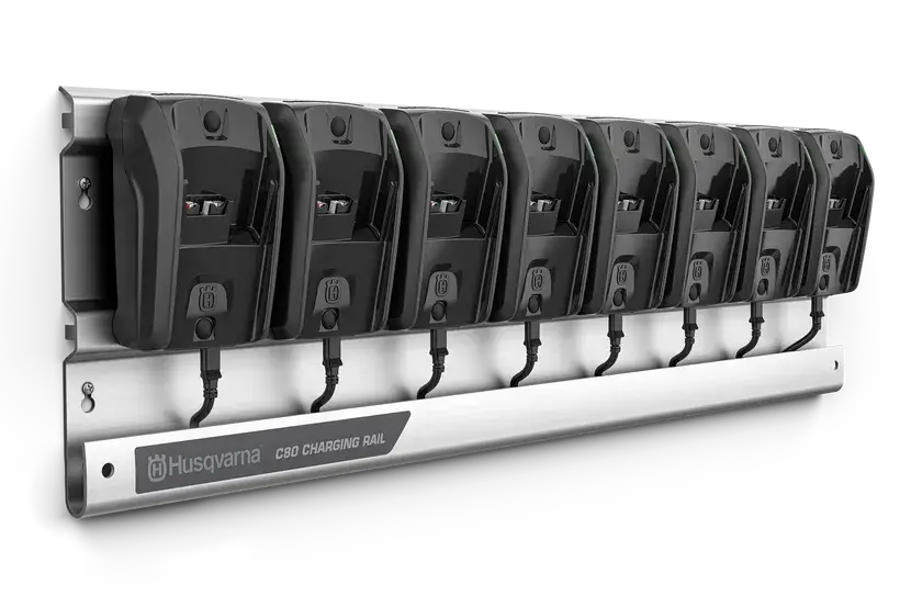 Husqvarna 40-C80 charging station offers a convenient way to charge up to eight Husqvarna BLiX 36 Volt batteries overnight.