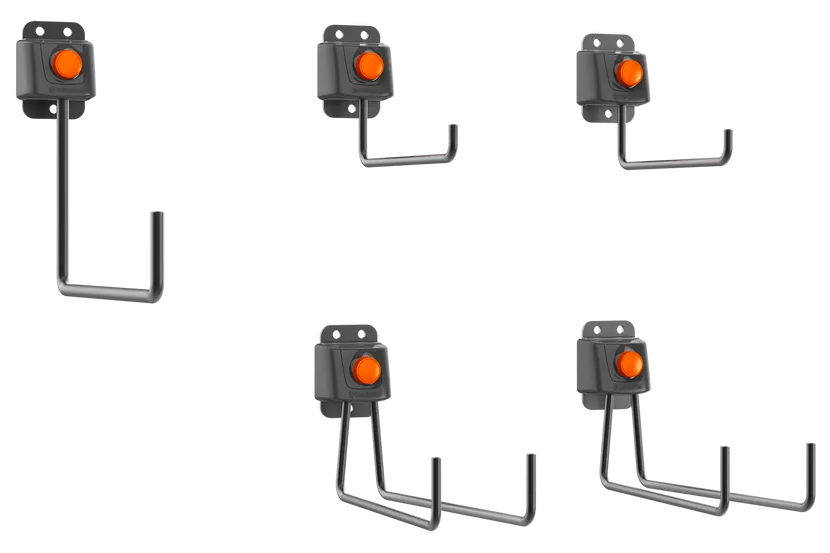 An accessory in the Aspire storage system, this 5-hook kit is optimised to fit the full Husqvarna Aspire range as well as the most common garden tools in your shed, such as hand tools, water hoses or brooms. Each hook can be attached to the wall-mounted Aspire storage rail or installed directly onto the wall ? enabling smart, effective storage. Coming in varying sizes, these single and double hooks of premium material conveniently and neatly organise all your garden tools with limited space.