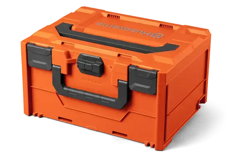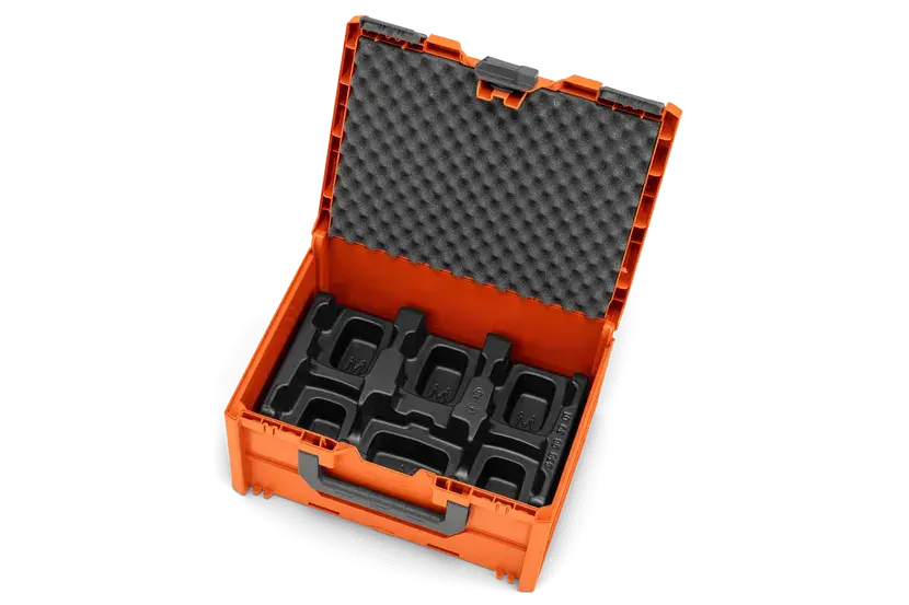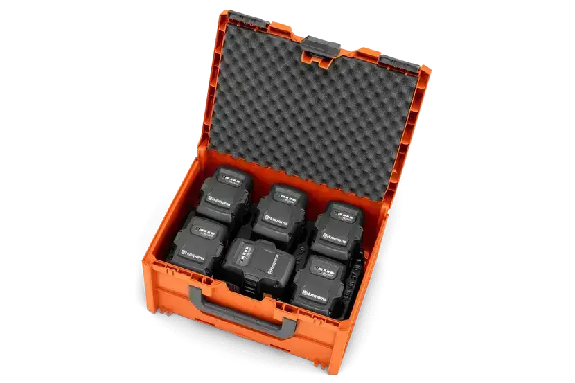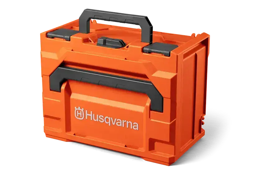Husqvarna Battery box M is a robust and handy case for transportation and storage of up to 6pcs of Husqvarna 36V M size* lithium-ion batteries. Ergonomic handles placed on both front and top for easy handling. The well thought-out design allows for stacking of multiple boxes and by adding the Husqvarna multi adapter plate (to be sold separately), the box can also be connected to third-part case systems. Insert M included.