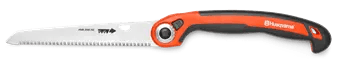 The Husqvarna Folding Saw 200?FO belongs to the new generation of Husqvarna saws. This saw has a total length of 470 mm, making it an easy-to-use all-rounder for cutting back thicker branches. It is ideal for all minor sawing work in the garden, and also for outdoor activities. It is lightweight and effective at the same time. The hard-chrome-plated saw blade has impulse-hardened precision toothing with triple grinding, which ensures fast results with little use of force, and a superb, precise cut. Notching in particular is made substantially easier. Rust has no chance to attack. You can carry this handy Folding Saw around with you in the garden, for example by safely folding it and locking it securely to put in your trouser pocket. Whenever you need your saw, simply open it up again using the thumb hole. The lock button holds the saw securely and safely in three different settings. And if you don’t require the saw, simply fold it together again. The saw blade will disappear safely into the beautifully-shaped handle. During sawing, a stop at the end of the handle prevents you from slipping. This has proven particularly useful during pulling movements, and assists you in making smooth progress. Thanks to the ergonomics, slightly angled handle shape and soft handle parts, this saw lies comfortably and safely in your hand. You can saw one-handed or two-handed as required. The saw can be stored without taking up much room and in a handy place using the eyelet.