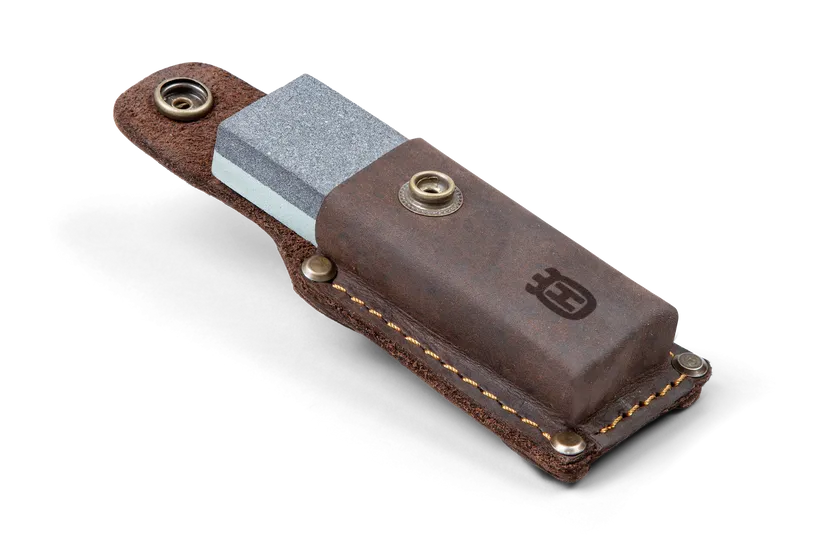 Small-size silicon carbide grindstone for sharpening axes. Dual grains, course and fine, for fast or fine grinding. Can be used both dry or with oil or water. Comes with a leather pouch.