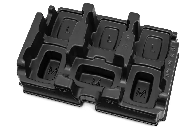 Robust insert for Husqvarna battery box, tailored for up to 3pcs of 36V M size* batteries and 3pcs of 36V L size** batteries.