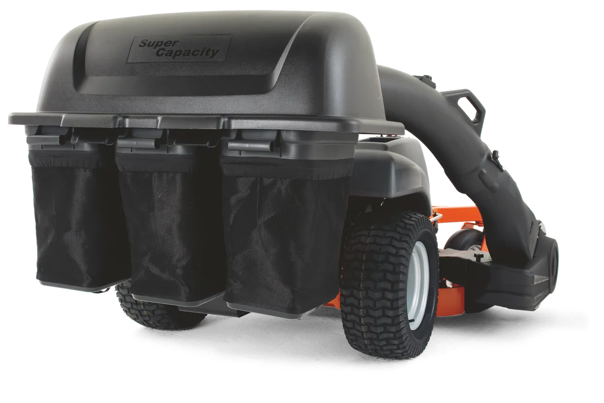 The easy to install bagger assembly features 9 bushel capacity, 3 nylon bags and a deck mounted spindle blower assembly for increased airflow.