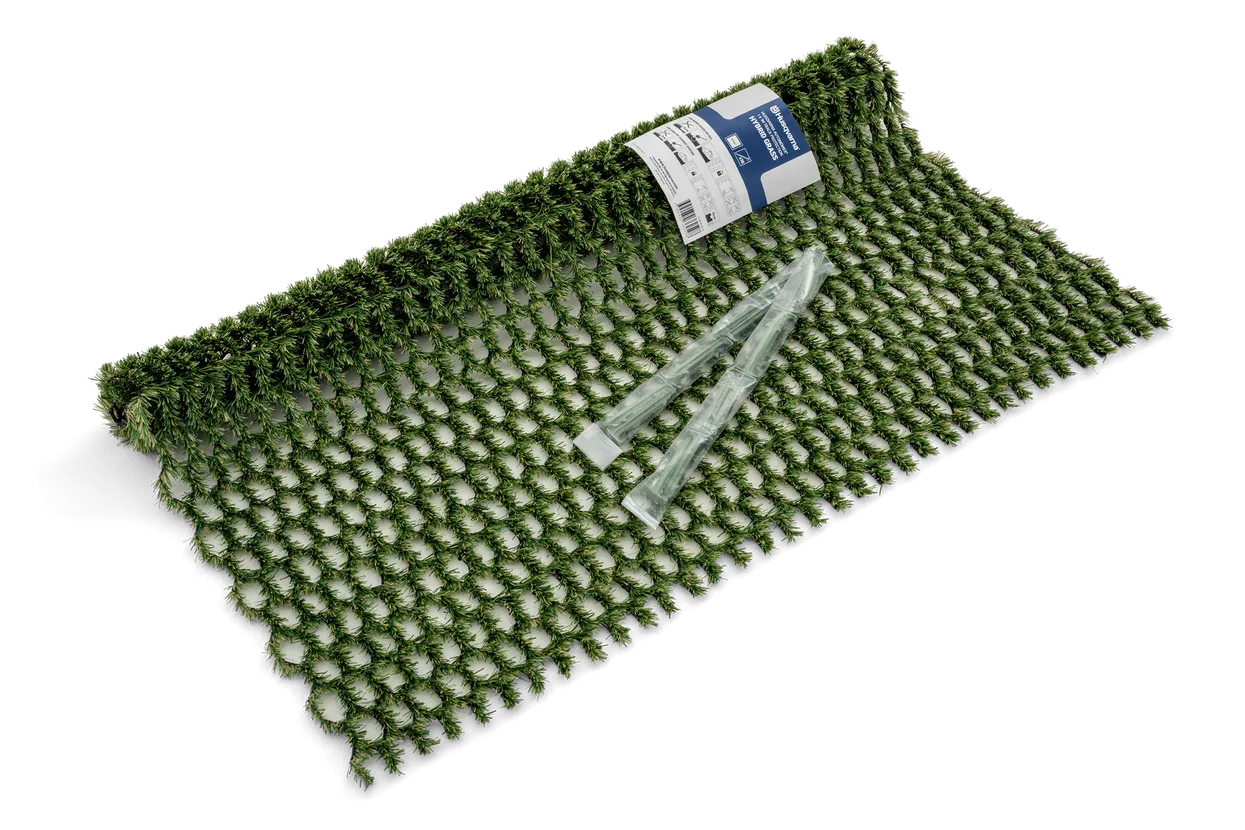 Hybrid grass provide grip to robotic mower for improved capacity in narrow and step areas. Prevent the Robotic mower from stop, spin and wear of lawn in slopes or frequent spots where limited possibilities for variation of distance to guidewire. 1×1 meter hybrid grass including 16 green stakes.